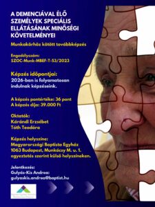 A továbbképzési program célja: A résztvevők ismerjék meg a mentális hanyatlással élő betegek korszerű gondozási lehetőségeit, valamint gyakorlati módszereit, különös tekintettel a gondozás szociális/egészségügyi intézményi